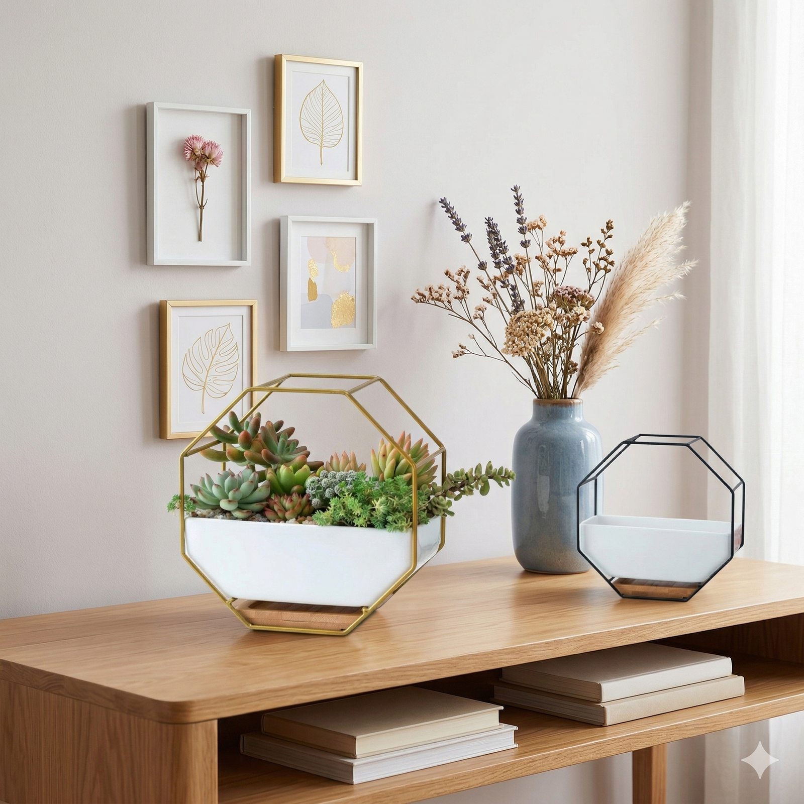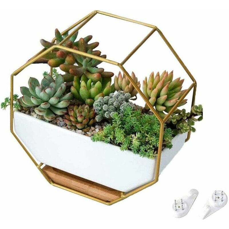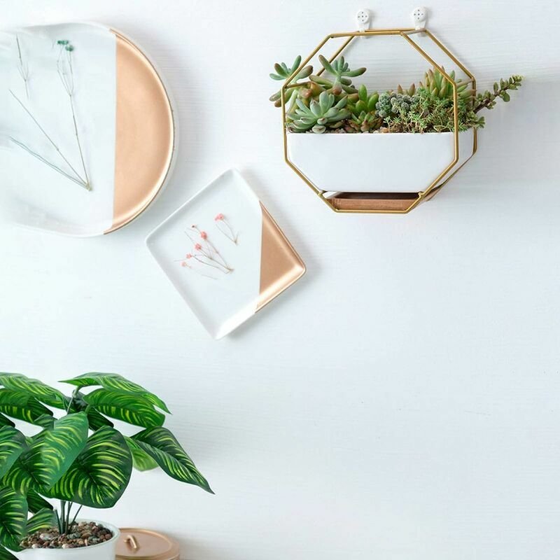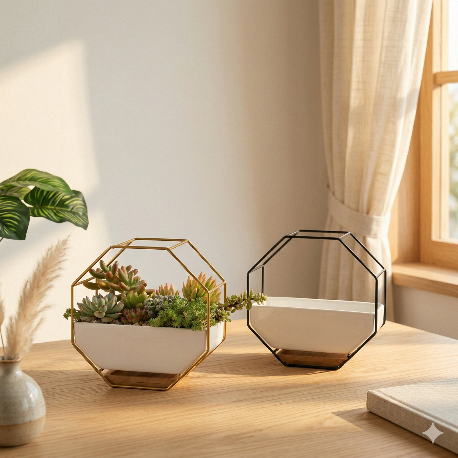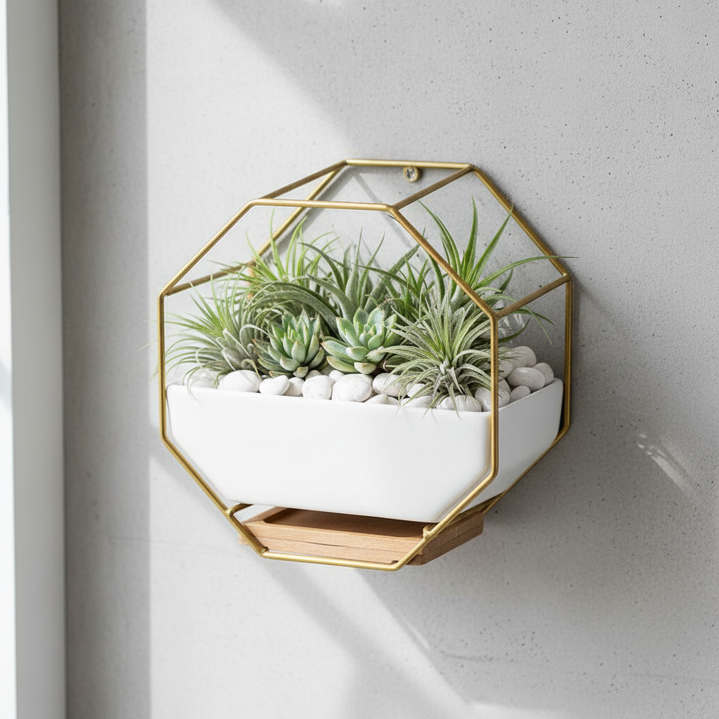 - Modern Geometric Design – Unique hexagon-shaped ceramic pot paired with a chic golden metal frame for a stylish, contemporary look.